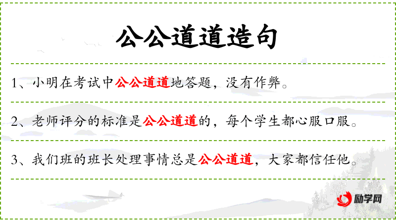 - 公公道道地:副词,表示公正、公平地进行某事。