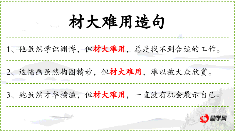 1. 【材大难用】 - 原意是能力强难用于小事。后形容怀才不遇。