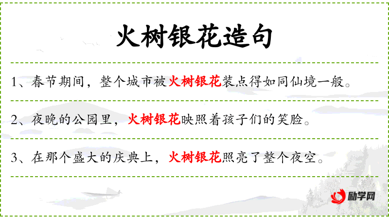 4. 【火树银花】 - 火树:火红的树,指树上挂满灯彩;银花:银白色的花,指灯光雪亮。形容张灯结彩或大放焰火的灿烂夜景。
