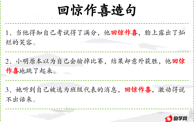 句子:“当他得知自己考试得了满分,他回惊作喜,脸上露出了灿烂的笑容。”
