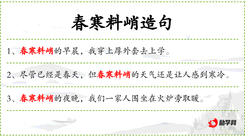- 春寒料峭:形容初春时节天气仍然寒冷。