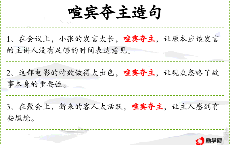 - 喧宾夺主:比喻次要的事物过于突出,反而掩盖了主要的事物。