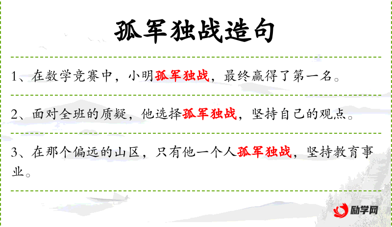 句子中的“孤军独战”是一个成语,源自古代战争中的战术,现在用来比喻在困难情况下单独奋斗。这个成语体现了文化中对坚韧不拔和独立精神的重视。