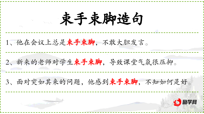 4. 【束手束脚】 - 捆住手脚。形容胆子小,顾虑多。