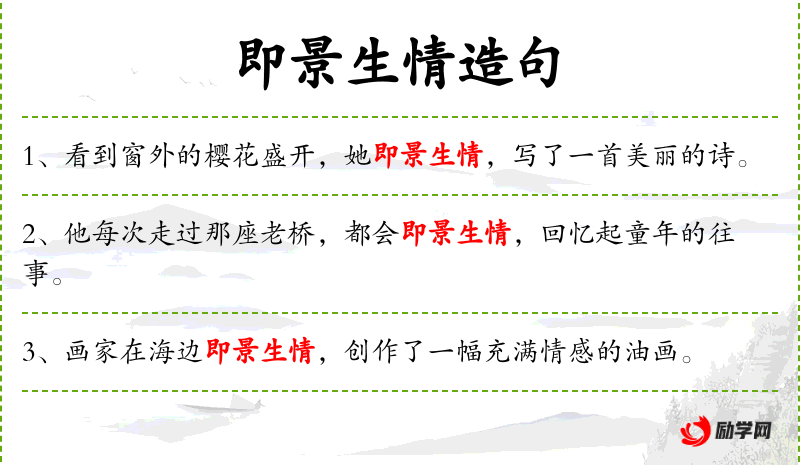 - 即景生情:成语,指看到眼前的景象而产生情感。