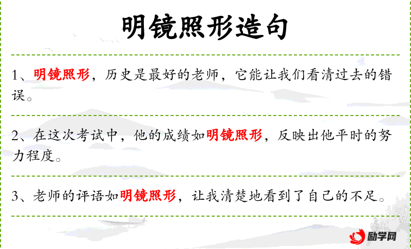 1. 【明镜照形】 比喻了解过去就可以知道现在。