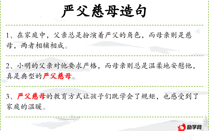 - 同义词:严厉(严格、严峻);慈爱(慈祥、温柔);深沉(深厚、深邃)。