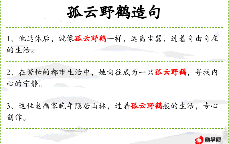 - 孤云野鹤:这个成语来源于传统文化,比喻隐士或超脱世俗的人。它体现了人对自由、宁静生活的向往。