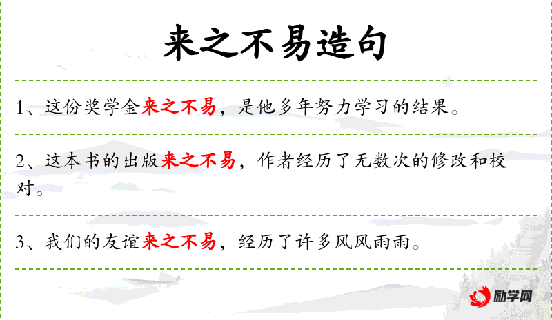 1. 【来之不易】 - 来之:使之来。得到它不容易。表示财物的取得或事物的成功是不容易的。