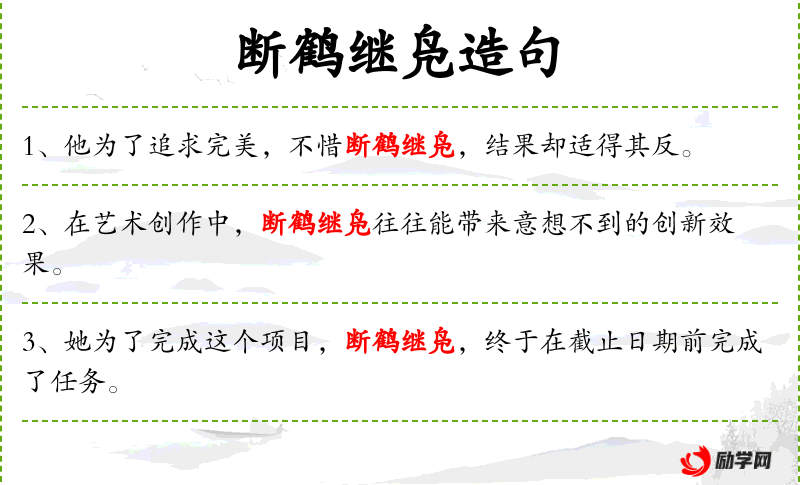- 断鹤继凫:这个成语源自古代,比喻不惜牺牲珍贵的东西来达到目的。在现代汉语中,这个成语较少使用,但仍能体现文化中对于决心和牺牲的重视。