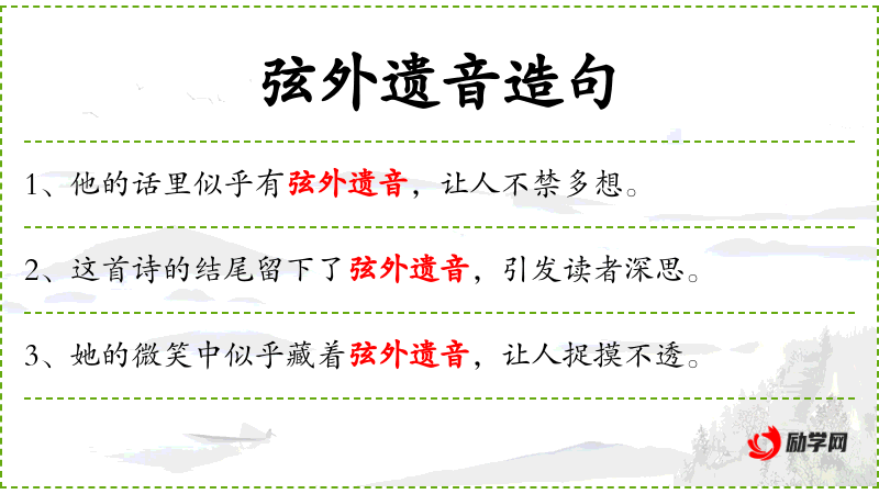 - 弦外遗音:比喻言外之意或未明说的含义。