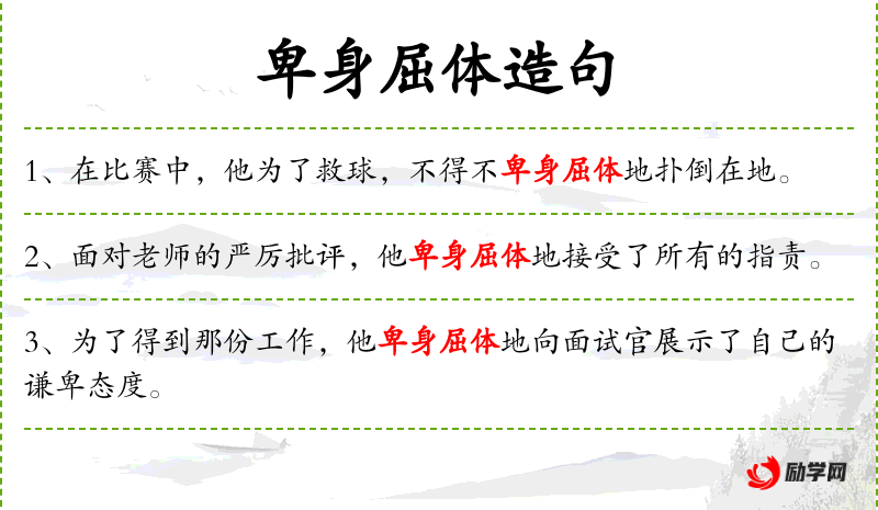 - 卑身屈体地:副词短语,形容词“卑身屈体”作状语,表示谦卑的态度。