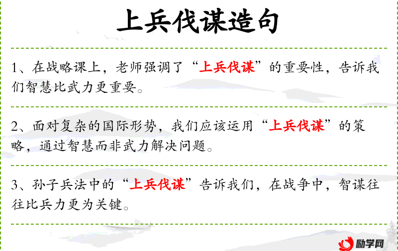 1. 【上兵伐谋】 上:上等,引申为最好的。兵:指战争,引申为用兵。伐:讨伐,攻打。伐谋:用计谋粉碎敌人的计策。用兵的上策,是以谋略取胜。