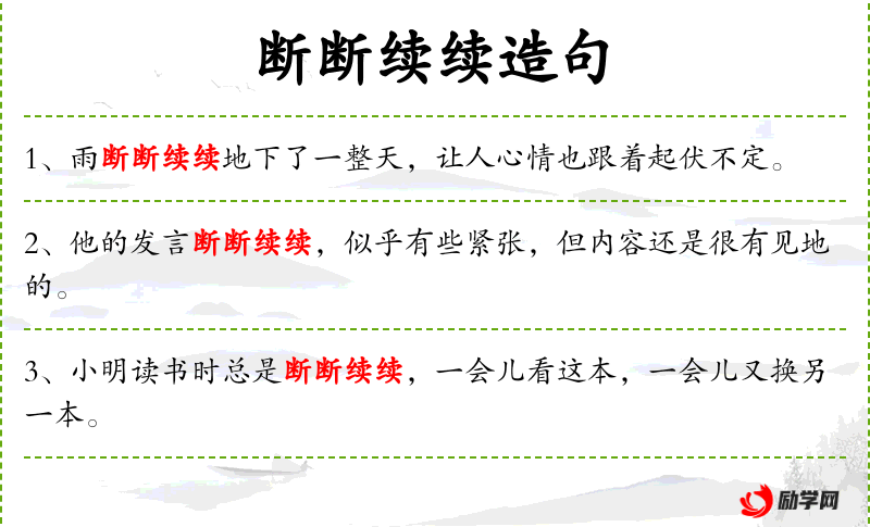 - 断断续续:副词,形容事物不连续、间歇性的状态。