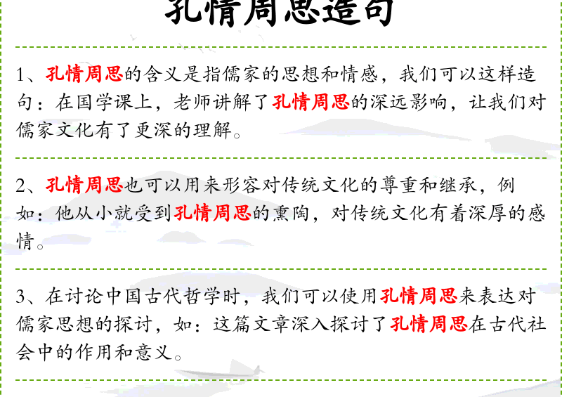 句子:“[孔情周思也可以用来形容一种文化氛围,例如:这个社区充满了孔情周思的气息,居民们都非常尊重和传承传统文化。]”