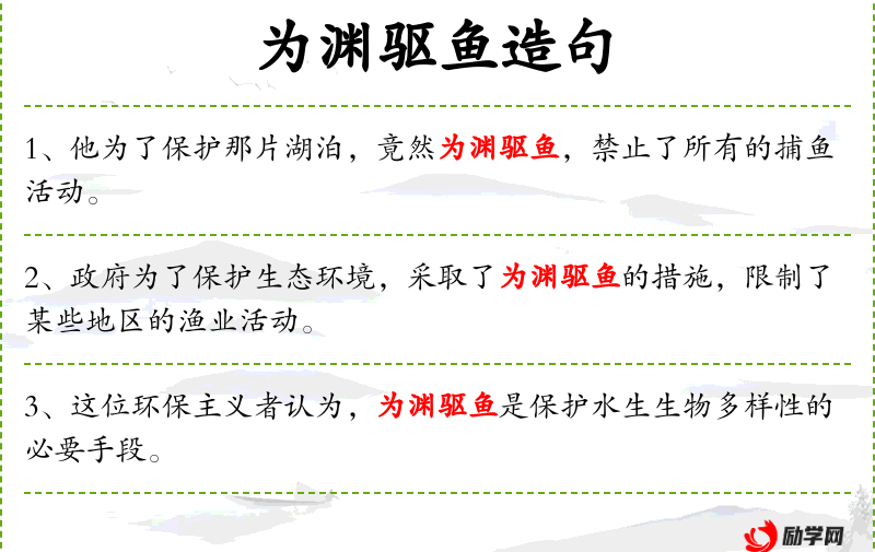 • 为渊驱鱼:这是一个成语,意思是采取措施保护水域中的鱼类。