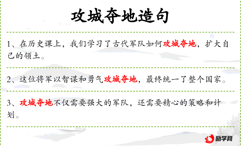 - 相关成语:“攻城略地”(攻占城市和领土)。