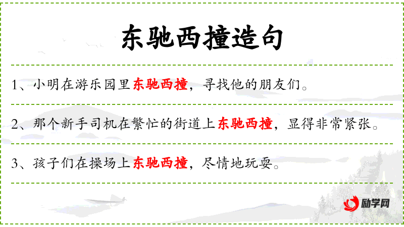 - 成语:东驰西撞,源自**传统文化,形容行动匆忙、没有方向。