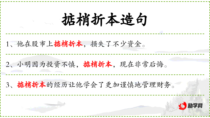- 英文:This experience of "掂梢折本" is a valuable lesson for him.