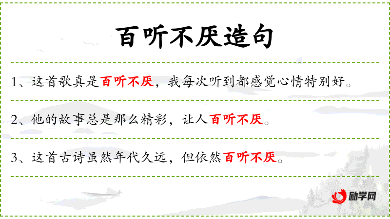2. 【百听不厌】 - 形容乐曲或歌曲好听,使人听多少遍也不厌烦。