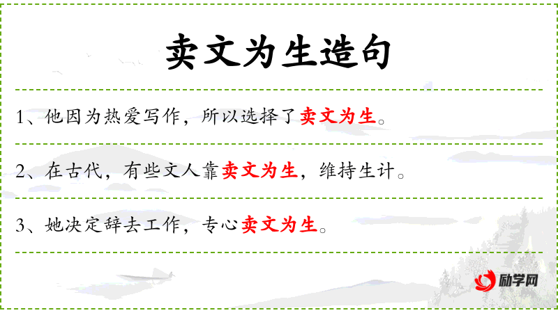 - 卖文为生:动词短语,指通过写作或卖文章来维持生计。