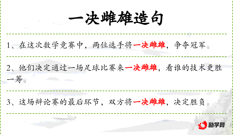 - 相关成语:一决雌雄、一较高下、一决胜负等。