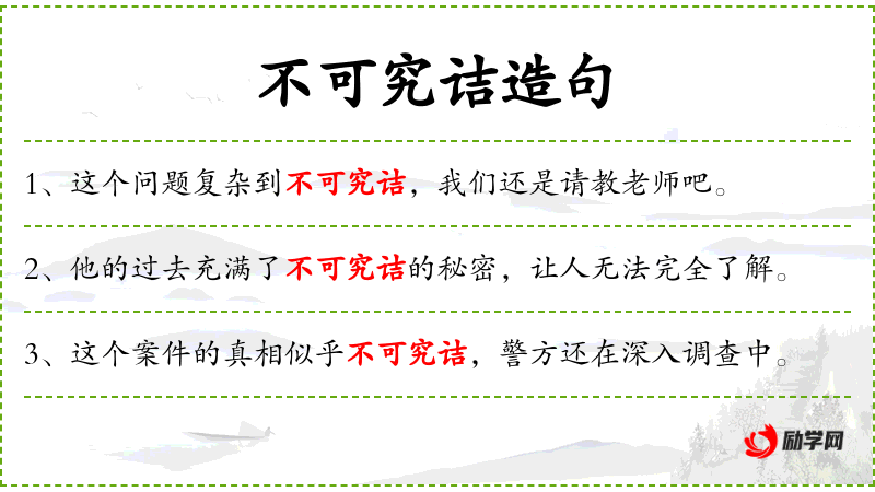- 不可究诘:难以捉摸、神秘莫测。