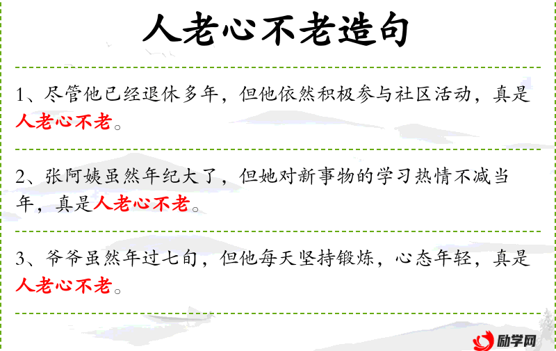 - 人老心不老:形容人虽然年纪大,但心态年轻。