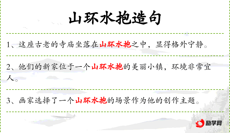 - 英文:The travel guide recommended a resort surrounded by mountains and embraced by waters, ideal for family vacations.
