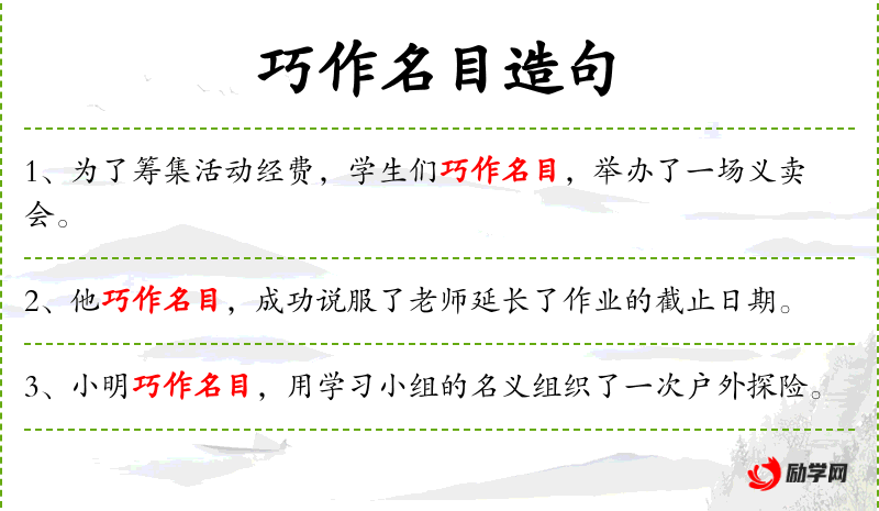 - 相关成语:“巧立名目”(to invent excuses)