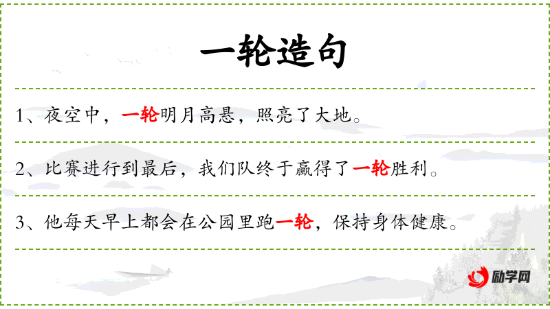 1. 【一轮】 表数量。用称圆月﹑红日等; 表数量。用称循环一次的事物或动作; 特指月亮; 表动量。犹一转。