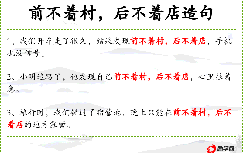 - 成语:“前不着村,后不着店”是一个典型的成语,反映了人对于孤立无援状态的描述。