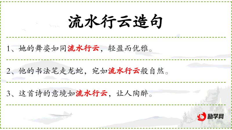 3. 【流水行云】 - 形容文章自然不受约束,就象漂浮着的云和流动着的水一样。