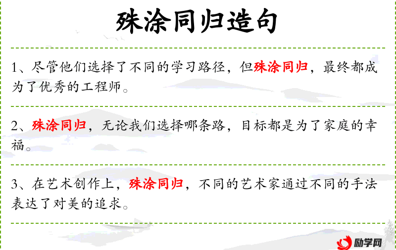 1. 【殊涂同归】 - 本指由不同途径达到同一目的地。后比喻采用不同方法得到相同结果。
