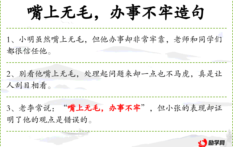 - 相关成语:“嘴上无毛,办事不牢”(形容年轻人缺乏经验,办事不稳妥)。