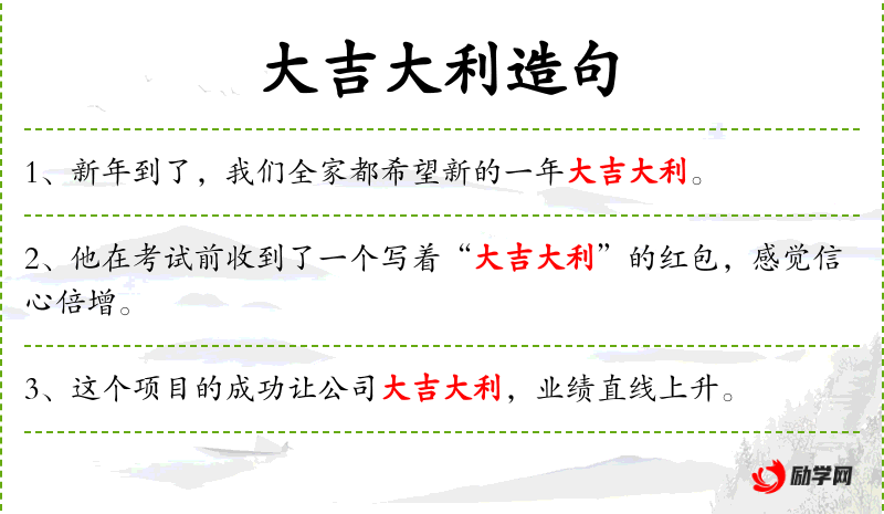 - 大吉大利:成语,意为非常吉祥和顺利。