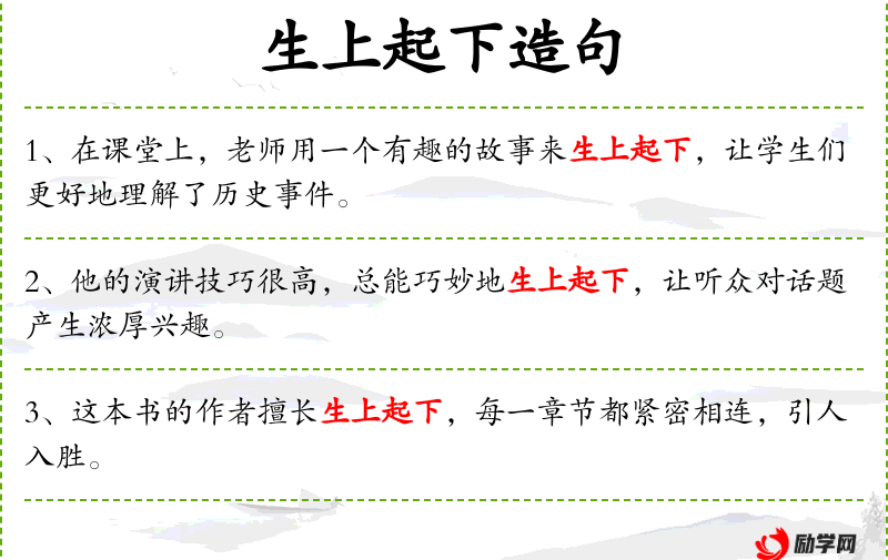 1. 【生上起下】 - 犹承上启下。承接上面的,引起下面的。