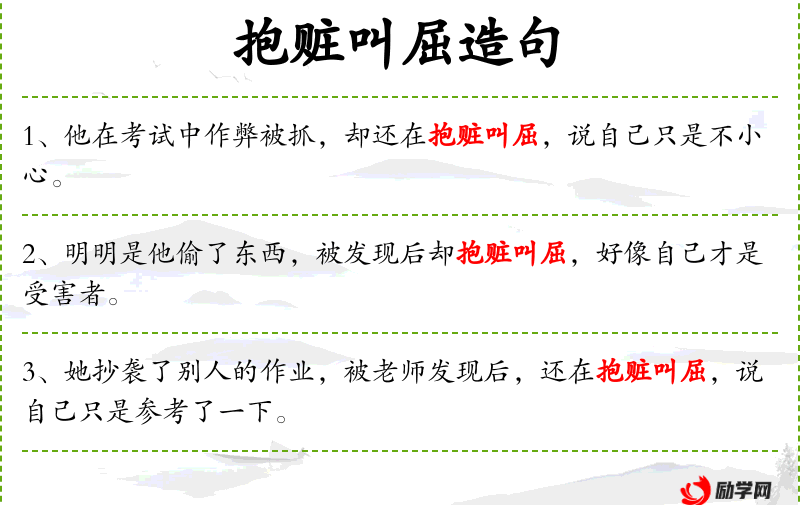 - 相关成语:抱赃叫屈(虽然做了错事但还在辩解)