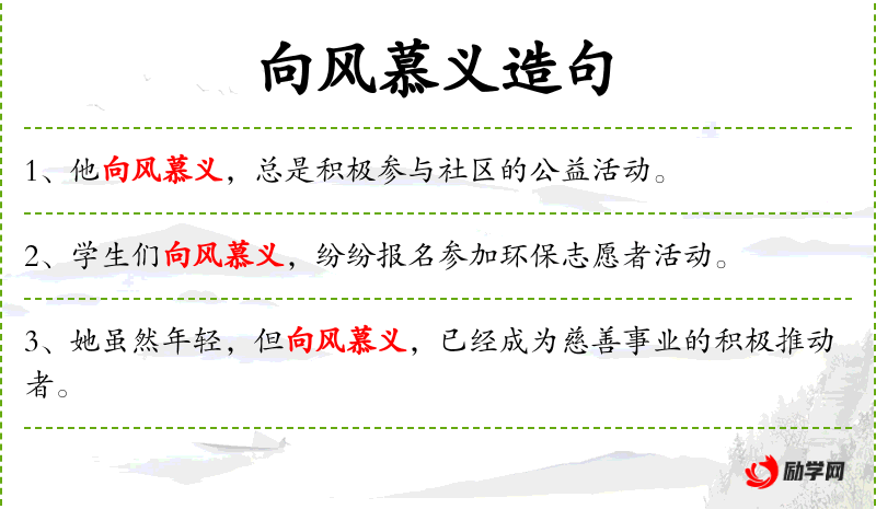 句子:“学生们向风慕义,纷纷报名参加环保志愿者活动。”