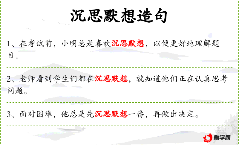 4. 【沉思默想】 形容深入地思考。沉:深。默:不作声。