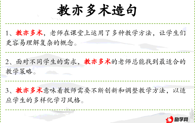 - 教亦多术:指教学方法多样,是教师必须掌握的技能。