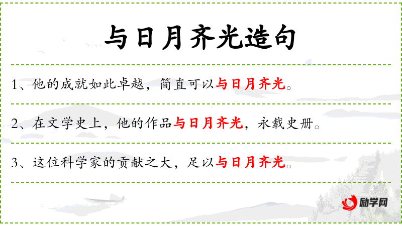 2. 【与日月齐光】 - 与太阳、月亮的光芒相当。常用以称赞人的精神、功业伟大。