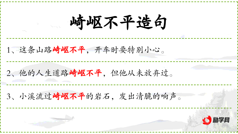 1. 【崎岖不平】 崎岖:地面高低不平。形容道路高低不平。