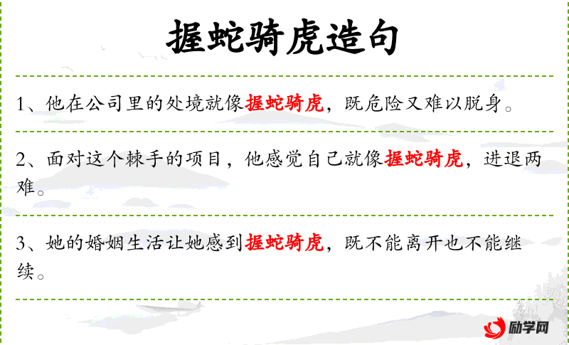 - 握蛇骑虎:成语,比喻处境非常危险,稍有不慎就会陷入更大的困境。