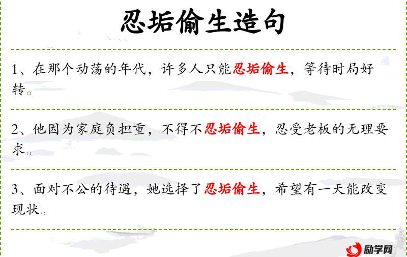 - 忍垢偷生:这个成语反映了中华文化中对于坚韧和忍耐的重视。