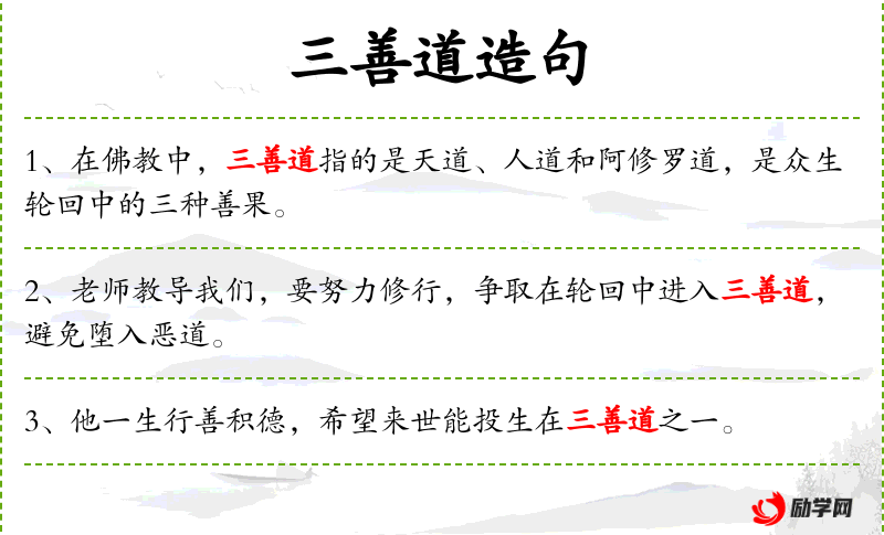 1. 【三善道】 佛教语。谓六道轮回中与善业相应的三个趋生之所。即上品善业趋生的天道,中品善业趋生的人道,下品善业趋生的修罗道。
