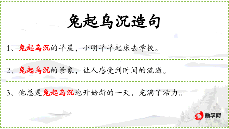 - 兔起乌沉:这是一个成语,形容太阳升起和落下,比喻时间的流逝。