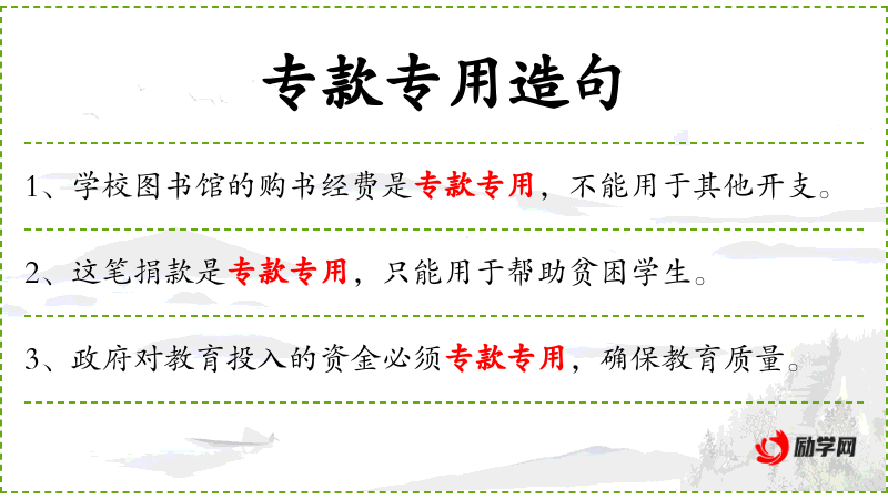 1. 【专款专用】 专门用于指定项目的钱款专项使用。