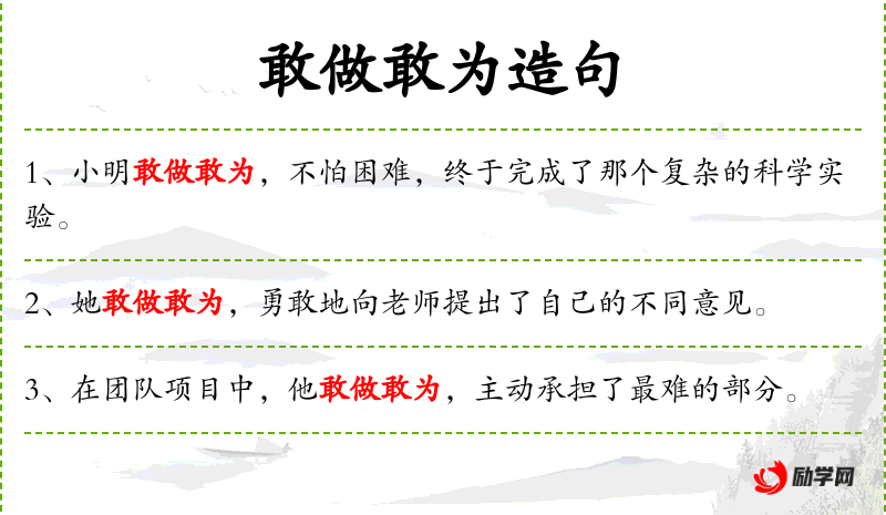 - 敢做敢为:形容词性短语,表示勇于行动,不畏缩。