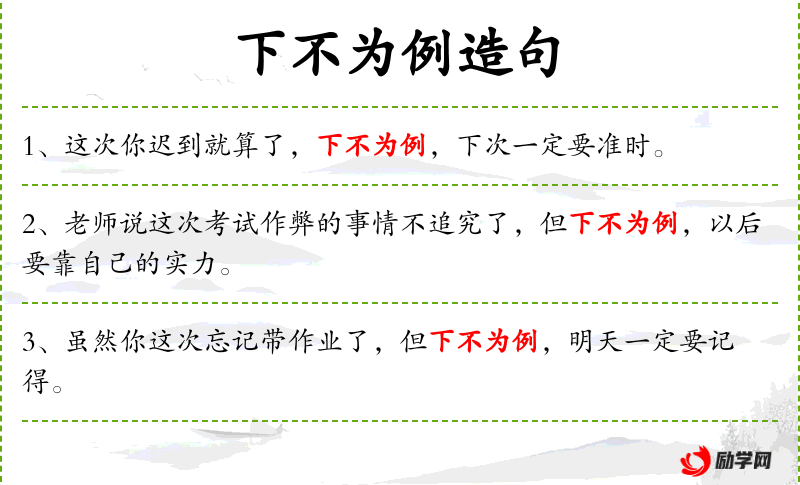 1. 【下不为例】 下次不可以再这样做。表示只通融这一次。